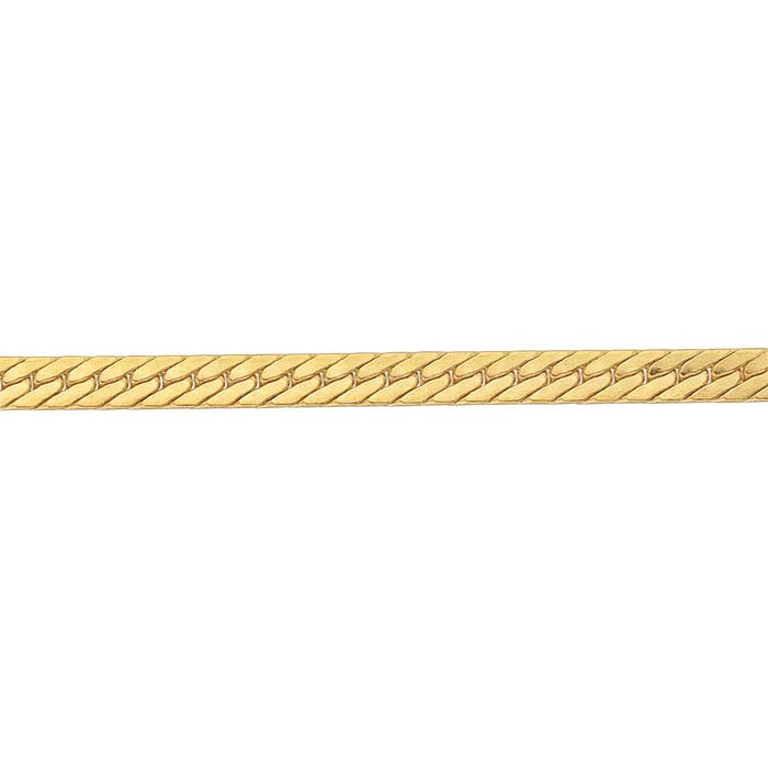 This 14/20 yellow gold-filled chain offers a classic look; the wide, flat profile of the chain lays flat across the neckline. It is ideal as a stand-alone statement piece; it is not recommended for pendants. This gold-filled chain is plated with 14-karat yellow gold to ensure a uniform color.Herringbone chain is constructed of multiple rows of V-shaped links, arranged so that the direction of each row is opposite the row next to it. The links lie flat giving the chain a low-profile, highly fluid look. Store this chain flat to help prevent kinking.