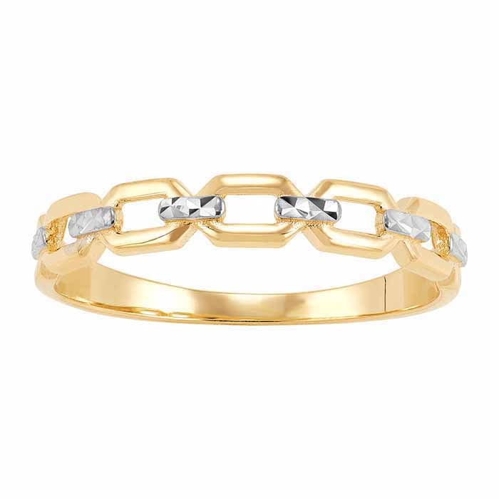 This 14-karat yellow gold ring features a chain-link pattern at the top with rhodium-plated accents. The ring looks great as a stand-alone accessory or stacked in combination with other rings.