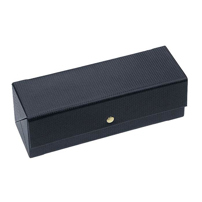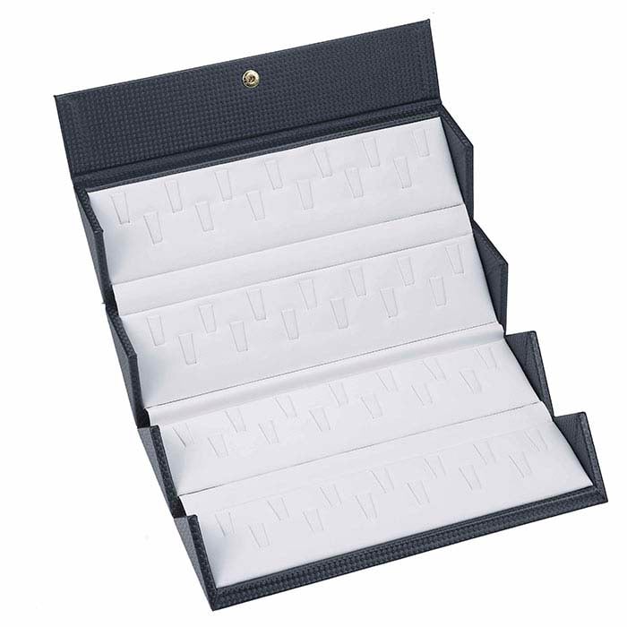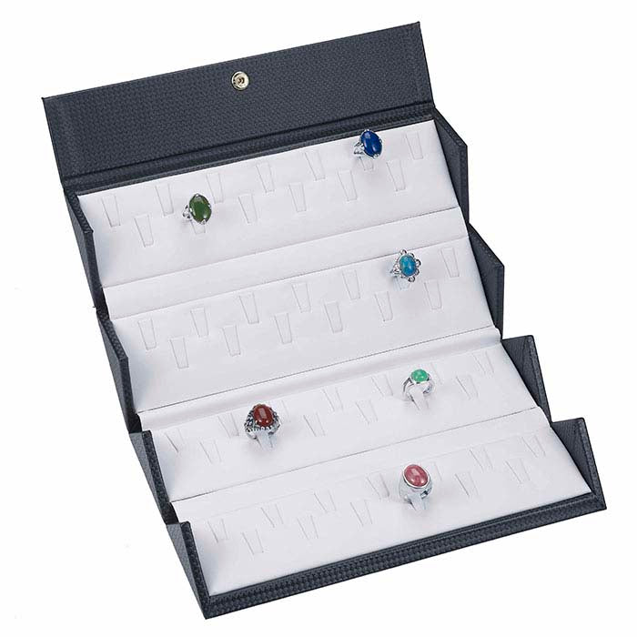 This hard-sided, fold-away ring case is a convenient way to transport, store and showcase a variety of ring styles. Simply secure up to 52 rings with the tabs inside the case, and roll up the case for easy storage. Black faux leather with a diamond pattern covers the cardboard box; white faux leather lines the interior.