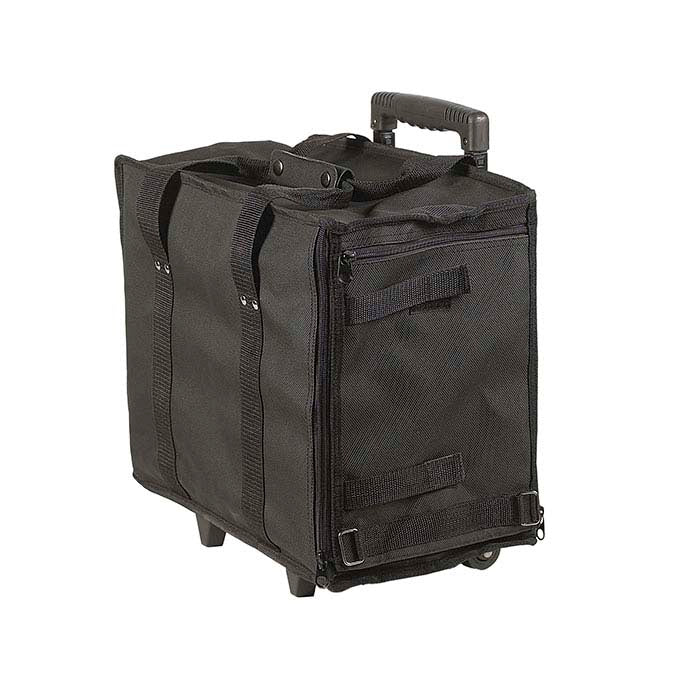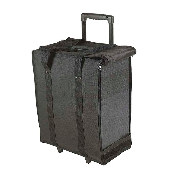 The soft-sided case is made of water-resistant textured nylon; edges and corners are reinforced and sewn. The interior of the case is padded and lined to cushion and protect trays. A zipper and hook & loop closures secure the lid. The sides and top of the case are reinforced by wide nylon web straps that form the handles at the top of the case; a snap-close vinyl cover makes the handles comfortable to carry. The case has two built-in plastic wheels and a discreet telescoping handle (extends to 16") that allow you to instantly convert the case for rolling when desired. Fold the case flat when not in use for easy, space-conscious storage.