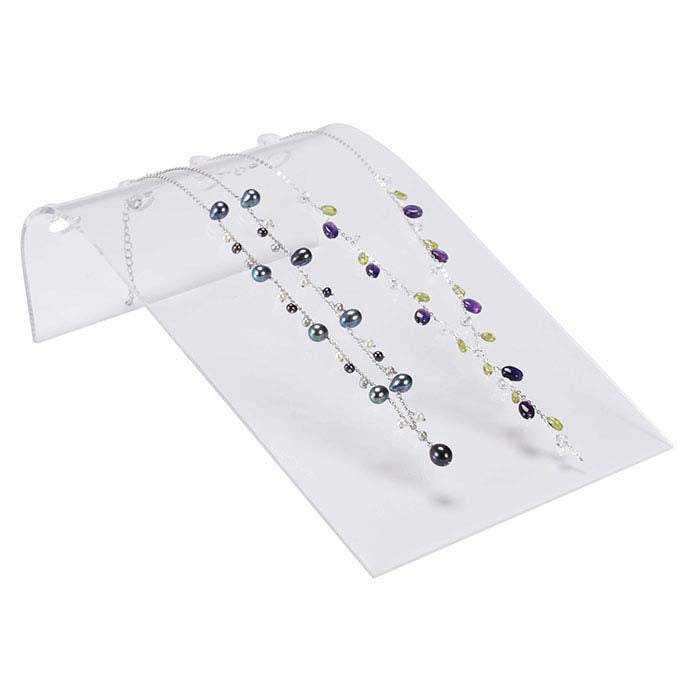 This clear acrylic ramp holds four necklaces on a modern, streamlined display; ramps are ideal for beaded and chain-style bracelets. The angle of the ramp shows the pattern of the jewelry along its whole length, at an angle for optimal viewing. Arrange each bracelet on the angled surface, then secure the end on one of the four hooks on the back of the ramp. Stack multiple ramps for easy transport and storage; use tissue paper between displays to prevent scratching. The acrylic is 1/8" thick with polished edges.