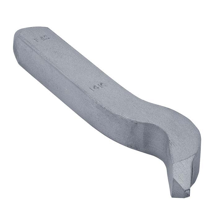 This bent marking stamp reads "14K"; ideal for quality-marking designs made with 14-karat gold. The stamp is precision-engraved from 5/16" tool steel oil-hardened to 58/62 HRC, delivering crisp, detailed surfaces and a long service life. Stamps with a bent shank have a notch near the tip that makes them ideal for stamping curved surfaces such as the inside of a ring or bangle; the slightly domed striking surface ensure a crisp, clean mark.
