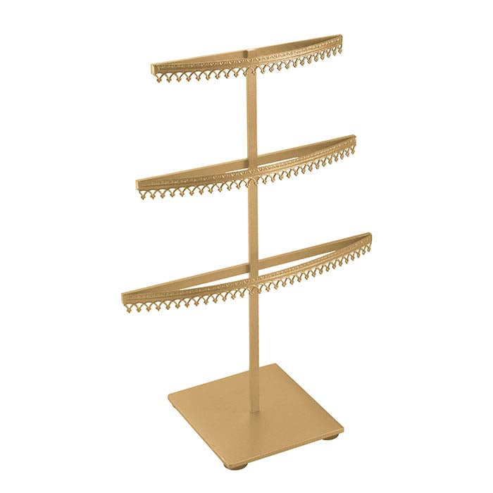 This sturdy earring display accommodates a variety of jewelry items and features three tiers, allowing you to showcase up to 26 pairs of clip, post, and hook-style earrings. The small 3" x 3" base is ideal for countertops and offers a secure yet easily accessible display option. A durable, gold baked finish covers the patented metal display and finely detailed royal crown tiers; there's 2-1/2" between tiers; the base is covered with felt.