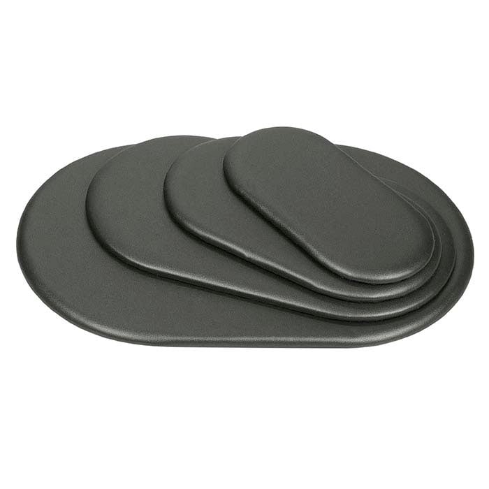 This set of pads, in charcoal-gray faux leather, is ideal for highlighting a variety of jewelry items, both as part of a showcase display and outside the case. Arrange these pads as part of the larger display; lay individual pieces on them, or use them to support groups of jewelry on smaller display stands. Or, when you remove a jewelry item from the case for a customer’s inspection, place it on one of these pads; it will help to highlight and protect the piece. The deep charcoal gray and slight metallic sheen of the “Steel” Vienna™ faux leather surface shows off white and yellow metals beautifully and provides an elegant alternative to traditional black. Faux leather covers sturdy cardboard forms.This set includes one of each size: