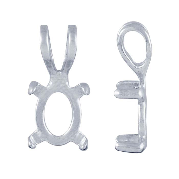 This sterling silver pendant features a cabochon mounting with four prongs that hold one 10 x 8mm oval cabochon or flat-back stone. The mounting features a flat, open base; the open back makes it lightweight and comfortable to wear. A tapered rabbit-ear bail makes it easy to add the pendant to cord or chain necklace and bracelet designs; a rabbit-ear bail is a tapered style that is split in half vertically, giving it the appearance of a pair of long, curving rabbit ears. Set your cameo or cabochon into the mounting, then burnish the prongs over the stone to secure it in place.