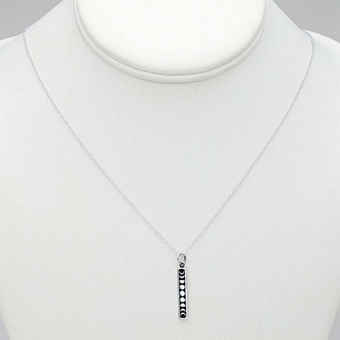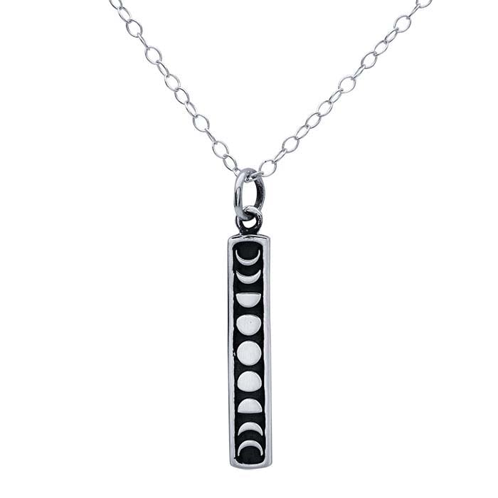 This finished sterling silver cable chain necklace features a 25 x 4mm pendant that depicts nine phases of the moon, with a full moon at the center, on an oxidized background, highlighting the design by its contrast.