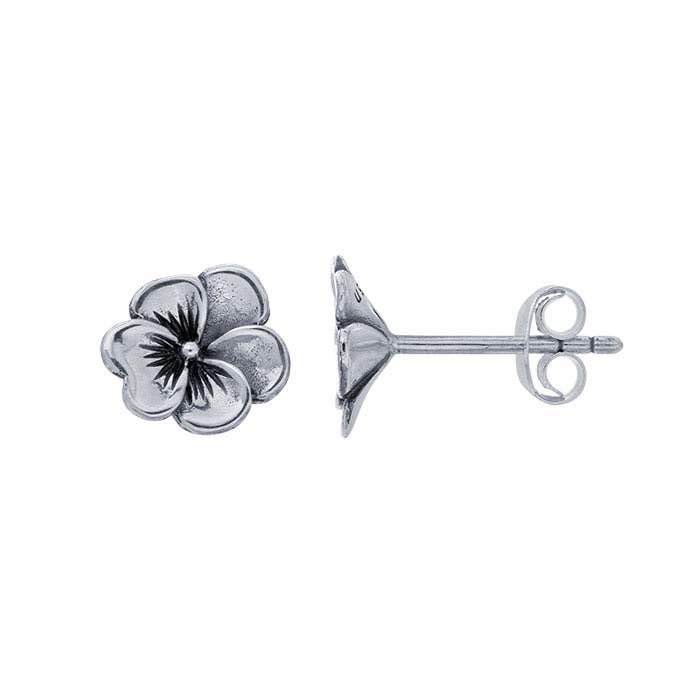This sterling silver post earring features a pansy flower with five petals and a center that is textured around its edges and has a bright, flat table, giving the appearance of a gemstone. The flower has a slightly concave shape and is oxidized to accentuate the petal design. The friction post features a groove that helps provide the most secure and comfortable fit; post earrings require an ear nut to keep the post in place.