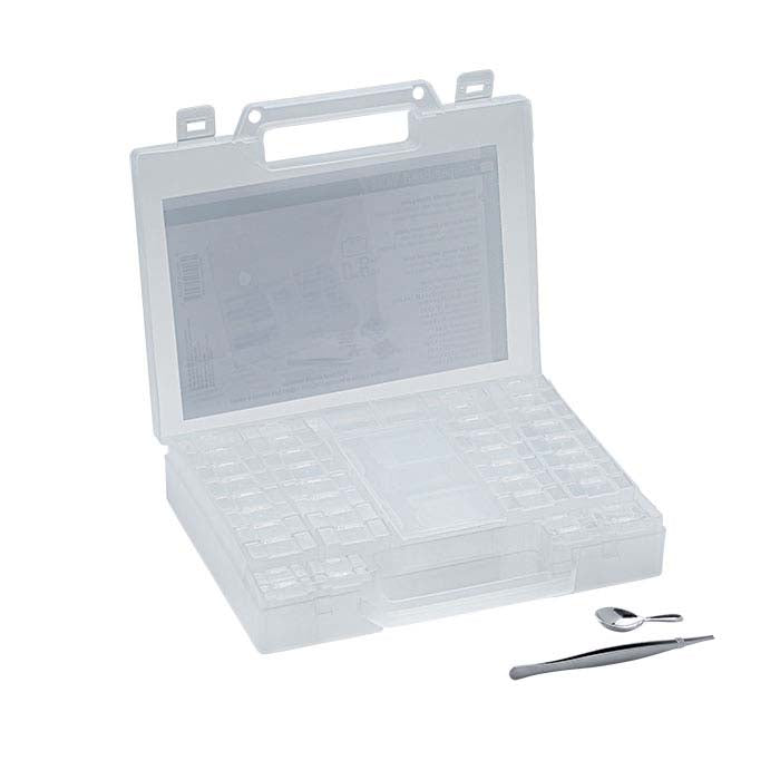 Keep your beads and other small components neatly organized with this clear plastic container. It offers 52 compartments in three: two medium, 34 small and 16 minis, each is a removeable box that allows you to create your own configurations. Double-snap lock latches and a built-in handle make this organizer ideal for taking anywhere with you. Includes a bead scoop and a pair of tweezers.
