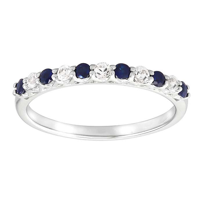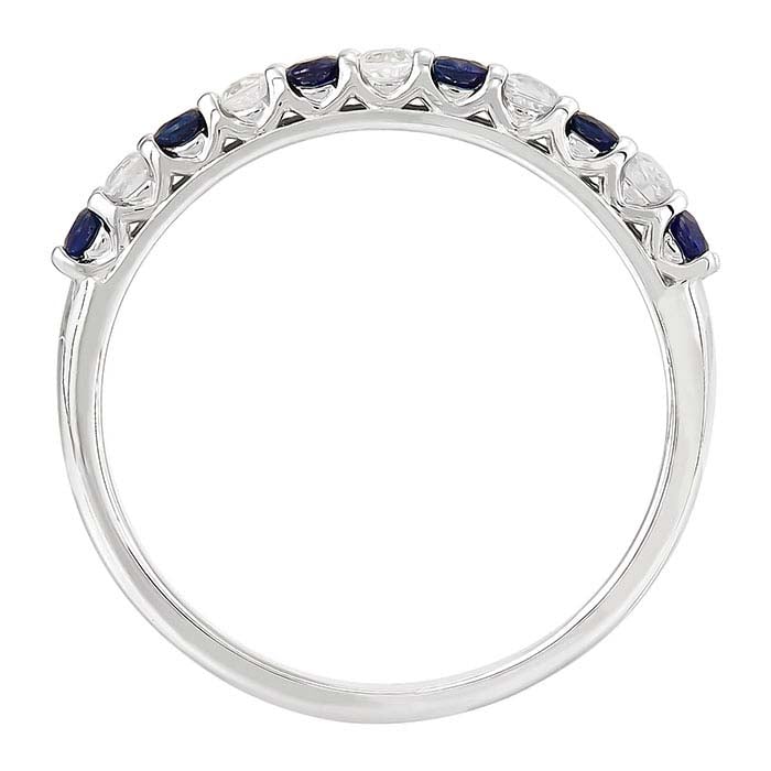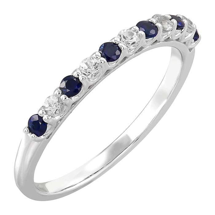 This 10-karat white gold ring offers a versatile design. It is set alternating 2mm round blue and white sapphires. The ring looks great as a stand-alone accessory or stacked in combination with other rings.