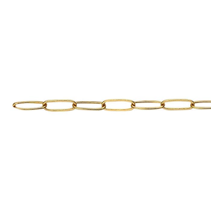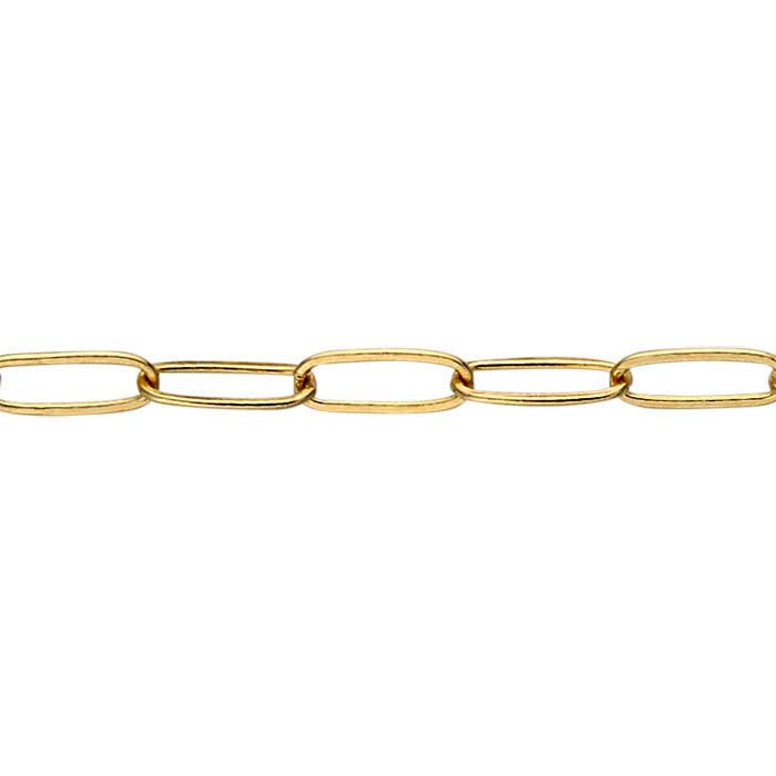 The long, flat links on this 14/20 yellow gold-filled chain catch the light and a have sleek look. Offer the chain as is, or use it as a foundation for your custom designs.The most common chain style, cable chains are formed by simply connecting single links perpendicularly end to end. Links may be round, oval or other shapes.This chain is sold by the foot, so it's easy to be sure you have as much chain as you need.