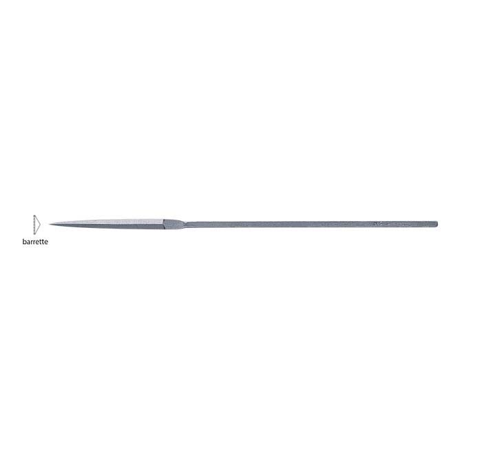 This Friedrich Dick barrette escapement file is ideal for your most delicate filing and shaping tasks, for smoothing tiny details, and for creating inside cuts. Use this double-cut file for refining flat surfaces as well as narrow areas, straight edges and structures, and outside curves. It has a broad-based triangle shape that tapers in width and thickness, and has teeth only on the bottom surface; the file is double-cut. The safe back prevents removal of metal from adjacent surfaces.This file has a German cut #5; German-cut files are graded by the number of teeth, counting teeth parallel to the long axis of the file. German cuts start coarser than Swiss and go finer, offering more increments for more precise cutting. In all cut styles, the higher the number, the finer its cut.A double-cut file features two sets of evenly spaced teeth set in two directions, one at a slightly different angle than the other. Double-cut files are designed to cut more aggressively, maximizing the work of each stroke to remove more metal with fewer strokes. At the end of the stroke, the file should be lifted from the workpiece and repositioned for the next stroke; dragging the file backward against the metal can mar the metal and damage the teeth.Escapement files are narrower and thinner than standard needle files with shorter cutting surfaces and longer, square handles. Effective on gold, silver, platinum, titanium, steel and other metals, escapement files are best suited for work that requires little metal removal.Among the finest jewelers' files in the world, Friedrich Dick files are made of tough chrome/tool steel alloy and precisely machined to yield sharp corners and fine points. These files have deep-cut teeth that provide efficient, uniform stock removal and are 66–67 HRC hardness for exceptional service with minimal care.