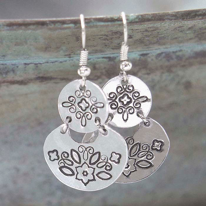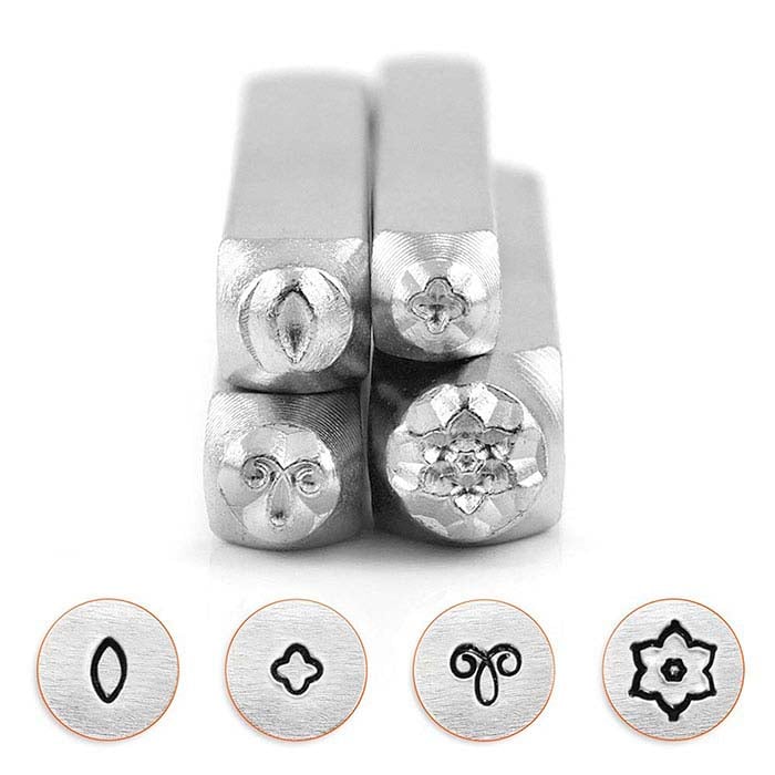 Quickly add decorative details to your jewelry with this ImpressArt® design stamp set. The stamps have a straight shank and are perfect for marking flat surfaces such as quality or brand tags, discs, stampings and other components. Each stamp is labeled on its side for easy identification and orientation. This ImpressArt® stamp set includes four stamps that can be used individually or together to create mandala and other designs. ImpressArt® stamps are cut from hardened steel and tested for Rockwell hardness and perfect alignment. They are great for stamping soft metals including brass, copper, nickel silver, gold, silver and aluminum. Stamps with a straight shank have a flat tip face that's perpendicular to the tool shank. Designed to work perfectly with the specially made Ergo-Angle™ stamping hammer and Simple Strike Jig™ (each available separately), these stamps are durable, providing consistent metal-stamping success when creating custom, personalized jewelry items. For best results—and because any stamped mark is not easy to remove once it's made—it's important to practice before attempting to mark your jewelry designs. Scrap pieces of sheet or flat base metal components are ideal for helping you get the feel of both the stamp and the power needed for an effective hammer strike. Use a brass mallet to strike the stamp to help prevent damage to your stamp, and support your workpiece on a bench block or an anvil. Finally, do your stamping before setting stones so that there is no risk of damaging settings or loosening set stones.