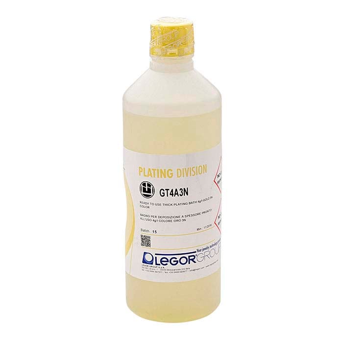 Legor® GT4A3N heavy-deposition solution allows you to plate workpieces with a rich yellow color, similar to 18-karat yellow gold—the color precisely corresponds to the normalized NIHS standard 3N gold. A wide range of possible plating thicknesses makes this solution ideal for decorative plating applications that require a greater thickness (up to 3 microns). The solution provides a dependable color and a deposit that is 99.7% gold by weight. Use this plating solution with a platinized titanium anode.Contains 4g of 24-karat yellow gold.