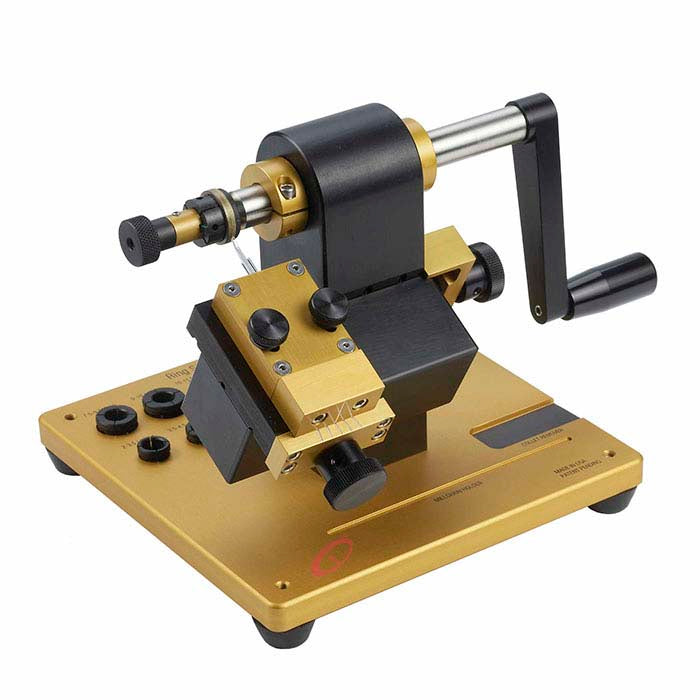 Create designs on your rings—even on angled or perpendicular surfaces—with this millgrain machine. This hand-operated machine accepts both lathe millgrain tools and French millgrain tools and includes collets for ring size 2–14. This machine is quality-crafted of aluminum alloy with spring-action tool holders that ensure clean, crisp, even impressions. The machine is engineered and manufactured in the USA. Patent pending.