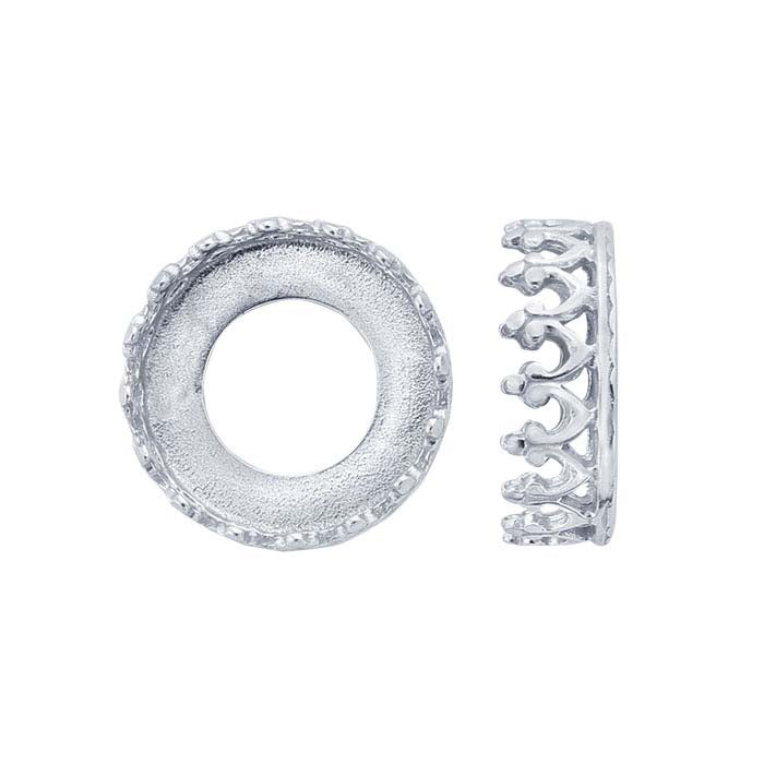 This open-back sterling silver bezel cup features a decorative, gallery-wire design and holds one 10mm round stone or glass cabochon, flat-back stone or crystal. With walls modeled from decorative gallery wire, this bezel cup adds distinctive flair to any design. This easy-to-use bezel cup saves you time and provides clean lines and a professional-looking finish. Use it to create everything from earrings to cuff links to pendants. Simply solder the bezel cup to a finding or design, and set as desired.