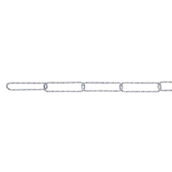 The long links of this sterling silver cable chain feature precise diamond cuts that create a light-catching appearance. Offer this chain as is, or use it as a foundation for your custom designs.The most common chain style, cable chains are formed by simply connecting single links perpendicularly end to end. Links may be round, oval or other shapes. Diamond-cut versions have facets precision-cut into the links with diamond-tipped tools. The facets are then polished to enhance the light-reflecting properties of the link surfaces.This chain is sold by the foot, so it's easy to buy as much or as little length as you need.