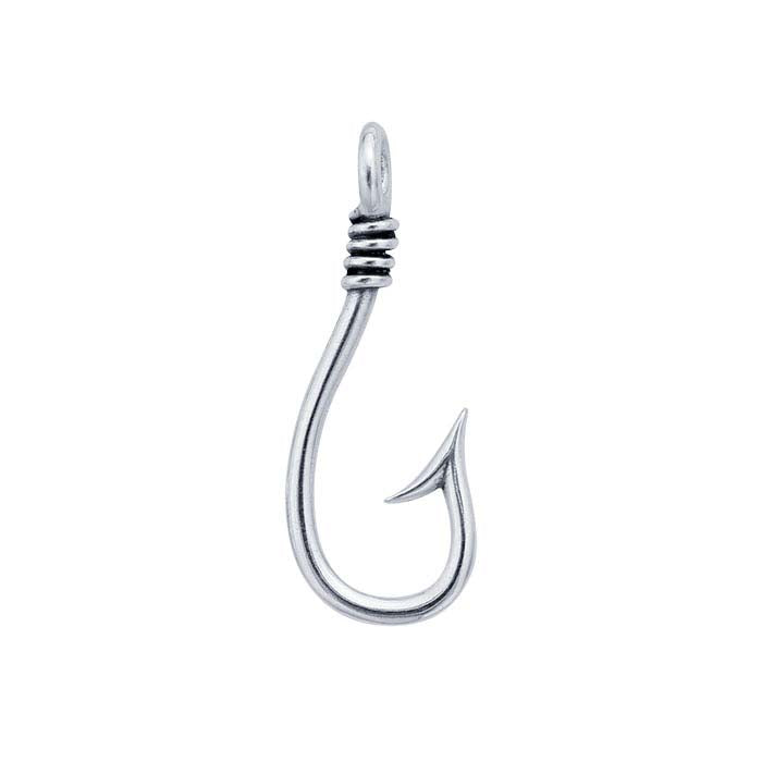 This sterling silver pendant features a fish hook with a decorative coil, barb and perpendicular ring. This piece is ideal as a single pendant on a chain or as one element in a themed design.