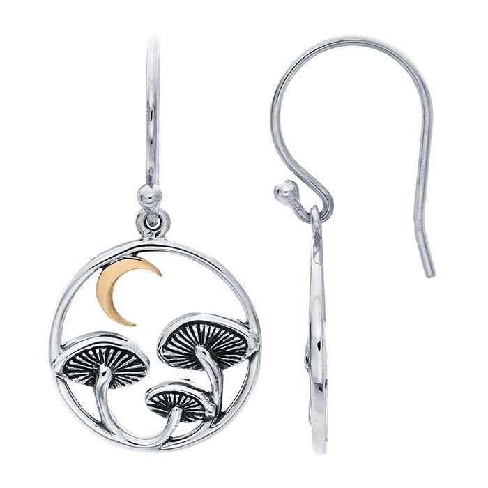These finished sterling silver ear wire earrings feature an open circle and have three mushrooms under a bronze crescent moon with oxidized details.