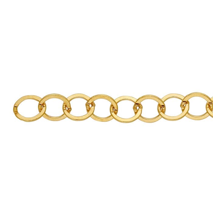 Flat links on this 14/20 yellow gold-filled round cable chain gives the classic profile a bold look. It makes a great partner for pendants and drops. The chain is plated with 18-karat yellow gold.The most common chain style, cable chains are formed by simply connecting single links perpendicularly end to end. Links may be round, oval or other shapes—the links of this chain are oval.This chain is sold by the foot, allowing you to have exactly the length you need when you need it.