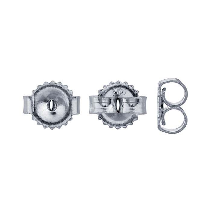 This 14-karat white gold friction ear nut is medium-weight, ideal for midweight earring designs featuring short drops or dangles. It features a smooth face with decorative scalloped edges. The friction between the wings holds the earring securely in place. This ear nut is rhodium-plated for a durable, tarnish-resistant finish.