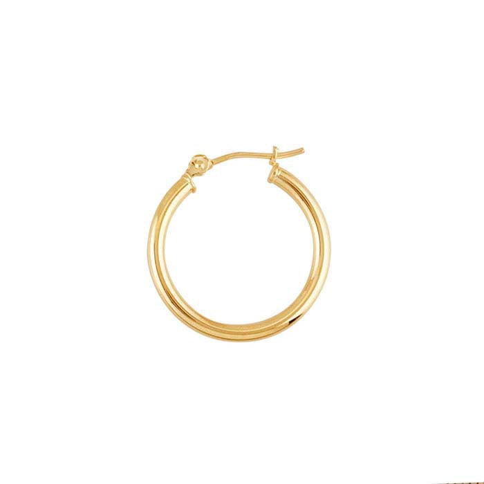 These finished 20mm-diameter 14-karat yellow gold hoop earrings are formed from 2mm tubing, making them lightweight and comfortable to wear. The hinged post simply clicks securely into the catch to create a fast, easy-to-use closure. Hoop earrings circle the ear from front to back and offer a wide variety of design options—they look great as-is or are ideal for attaching drop and dangle designs.