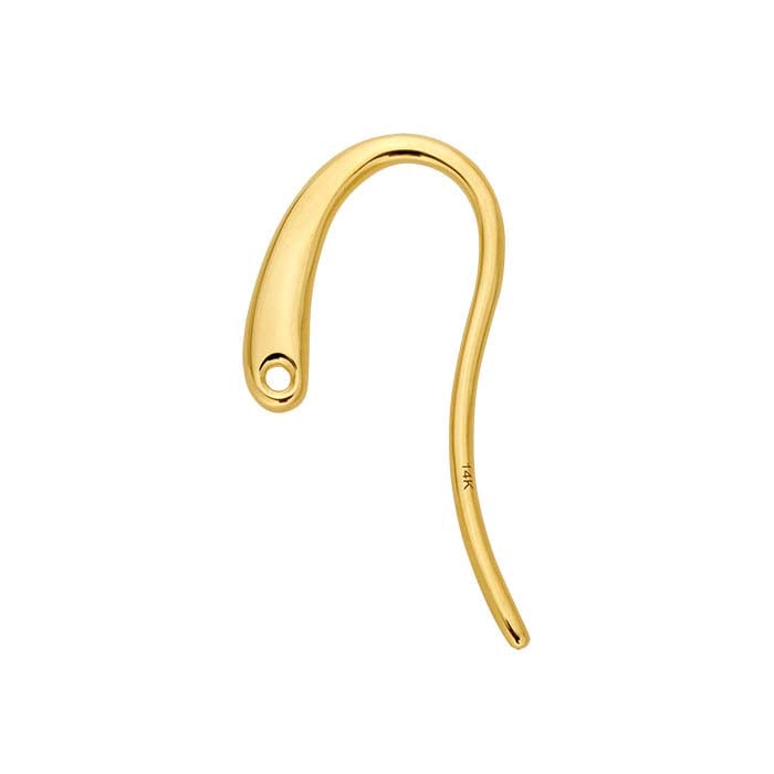 This 14-karat yellow gold ear wire features a flattened rounded profile and a hole for attaching drops or dangles. The ear wire is an ideal starting point for a wide range of earring designs.