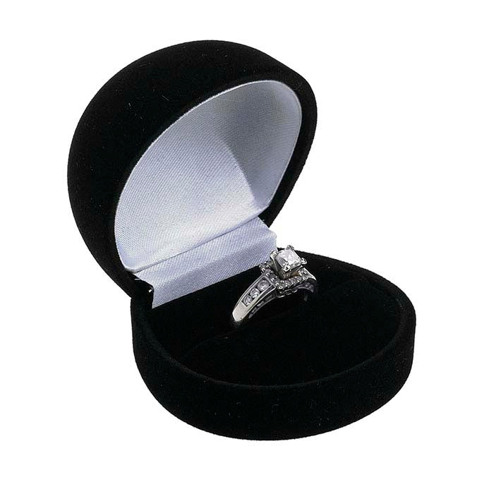Covered with black velour, this hinged ring box features a unique round design and is ideal for packaging or displaying one ring. Add a decorative ribbon, gift wrapping or bow (available separately) to customize the box. Black velour covers the plastic box with a white satin lining that covers the hinge; matching-color velour covers the cardboard insert. Delivered in a one-piece packer.
