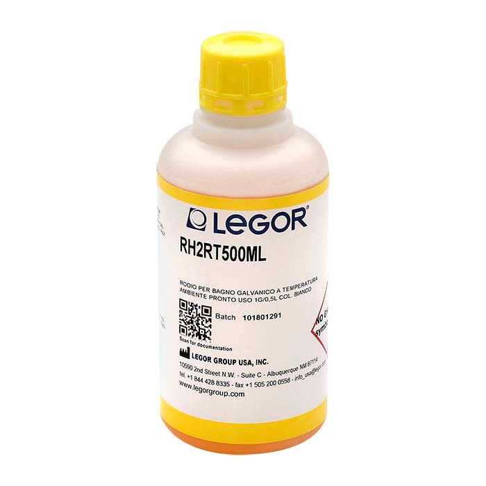 Made by Legor® Group, this RH2RT formulation offers exceptional brightness and operates at room temperature. This formula plates in half the time with a faster deposition rate, and decreased evaporation helps preserve your bath chemistry. You get Legor quality at a more economical price because the acid level in this solution is low enough that hazardous shipping charges do not apply. Rhodium is a bright white, tarnish-resistant, hard metal in the platinum group—ideal for giving jewelry a brilliant white finish. Plate rhodium directly onto platinum, gold or nickel only. With a preliminary nickel plate, you can plate onto silver and copper alloys. With a preliminary copper plate followed by nickel, you can plate rhodium onto tin, lead, brass and bronze alloys. Use rhodium with a platinized titanium anode. This 1/2-liter bottle contains 1 gram of rhodium.