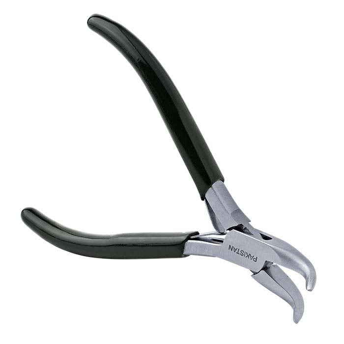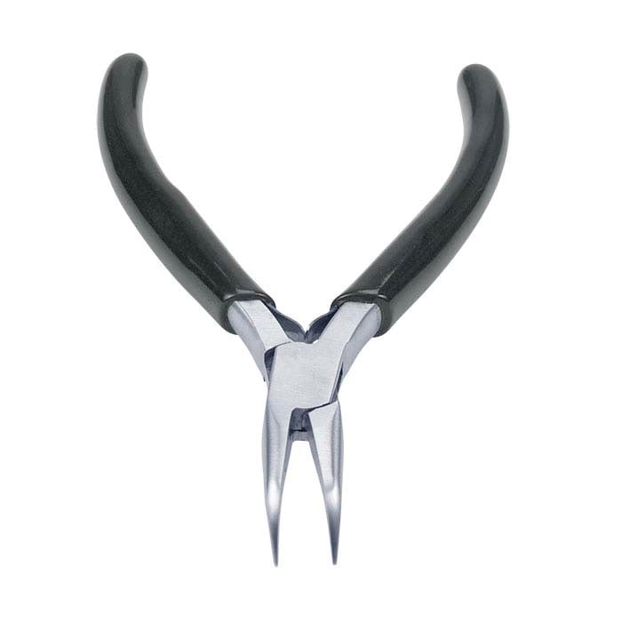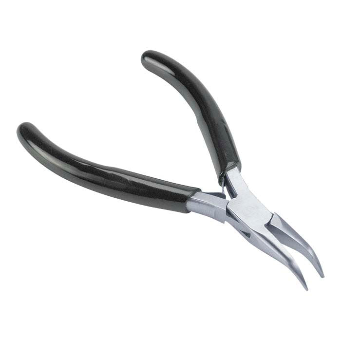 These slim bent chain-nose pliers are suitable for a variety of bench and wire-wrapping tasks; its smaller size and slender profile make it ideal for fine work and delicate tasks. On chain-nose pliers, both jaws are semi-round with flat interior surfaces, tapering to a point from the pivot to the tip. The jaw tips of these pliers are bent perpendicular to the joint, enhancing reach and visibility. The smooth finish on the interior surface of the jaws helps reduce the risk of marring delicate pieces. Use to open and close jump rings, for flat crimping and to make angled bends.