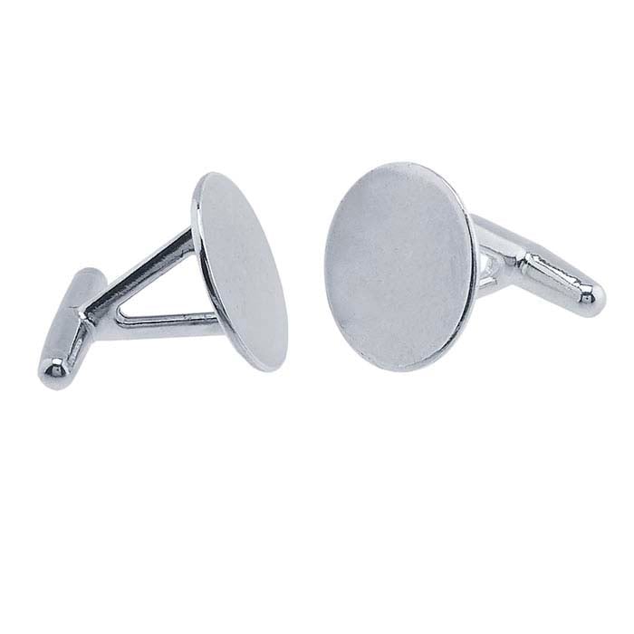 This sterling silver round flat-topped cuff link features a fixed end. Solder your design element into place or use jeweler's epoxy to secure a glass or gemstone cab or a flat-back crystal to the cuff link.