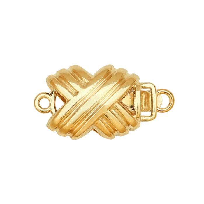 Ideal for use with pearl strands, this 14-karat yellow gold safety clasp features a corrugated “X” pattern that complements any style of necklace or bracelet. This secure closure is ideal for use with pearl designs and can be worn at the front or at the back of necklace and bracelet designs. Safety clasps (also called pearl clasps) feature two parts that connect in two different ways, providing a fail-safe that helps prevent loss of higher-value necklaces or strands and are ideal for pearl and gemstone strands. The interior part of the clasp is a slender hook with notches along the outer edge; the exterior part is hollow except for a locking bar. The interior part hooks over the locking bar and then slides inside the exterior part, the notches catching along the inner sides to hold the clasp securely closed. Even if the notches fail for any reason, the hook keeps the strand in place.