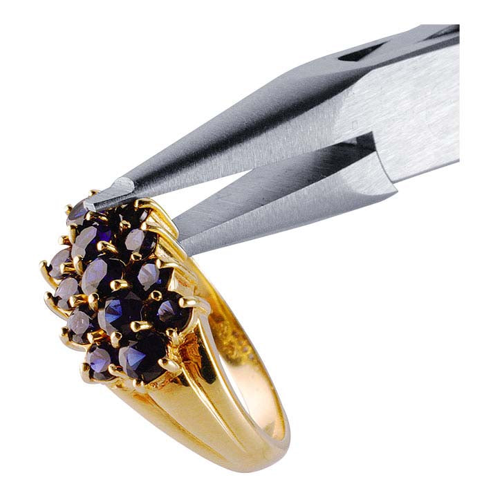 These high-quality, German-made prong-closing pliers have an extra-thin point on one side of one jaw, helping to reach tiny or hidden prongs. The jaws on stone-setting pliers are specially shaped to provide easy access to prongs. Use them to move prongs securely into place against the stone or to move prongs away when removing a stone from its setting. These pliers are ideal for setting stone clusters or very small settings. These pliers are made of hardened tool steel, forged and work-hardened for the best combination of strength and durability. The jaws will not be nicked with normal use and will keep their shape and finish. Use Cosmoline® or a similar protectant to clean this tool; avoid contact with moisture.