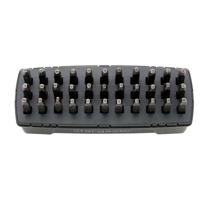 Quickly add decorative lettering or custom phrases to your jewelry designs with this ImpressArt® alphabet design stamp set. These stamps have straight shanks and are perfect for marking flat surfaces such as quality or brand tags, discs, stampings and other components. Each stamp is labeled on its side for easy identification and orientation. This set includes the complete alphabet (A–Z) plus seven additional shapes and punctuation marks and comes in a slotted case (6-3/4"W x 2-1/2"D x 3-1/4"H) with clear lid for easy, organized storage.ImpressArt® stamps are cut from hardened steel and tested for Rockwell hardness and perfect alignment. They are great for stamping soft metals including brass, copper, nickel silver, gold, silver and aluminum. Stamps with a straight shank have a flat tip face that's perpendicular to the tool shank. Designed to work perfectly with the specially made Ergo-Angle™ stamping hammer and Simple Strike Jig™ (each available separately), these stamps are durable, providing consistent metal-stamping success when creating custom, personalized jewelry items.For best results—and because any stamped mark is not easy to remove once it's made—it's important to practice before attempting to mark your jewelry designs. Scrap pieces of sheet or flat base metal components are ideal for helping you get the feel of both the stamp and the power needed for an effective hammer strike. Use a brass mallet to strike the stamp to help prevent damage to your stamp, and support your workpiece on a bench block or an anvil. Finally, do your stamping before setting stones so that there is no risk of damaging settings or loosening set stones.