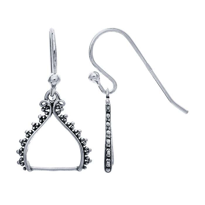 These finished sterling silver earrings feature a 2mm ball end on the ear wire and a beaded stirrup dangle that is oxidized to accentuate the design.