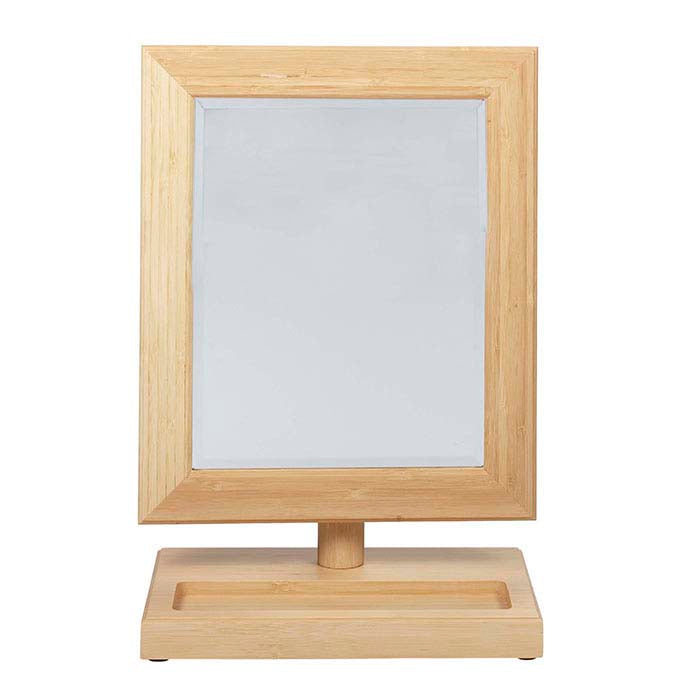 Mirrors are ideal for allowing customers a close look at how your jewelry items will look when worn and helping to encourage a decision to buy. This single-sided adjustable mirror (7-1/4"W x 9-1/4"H) is framed in genuine, lightly finished bamboo; the frame is miter-cut and beveled for an attractive presentation in any setting. The tray in the base is ideal for holding small objects. Round foam-rubber pads protect your counters and the bottom of the mirror base against scratching.