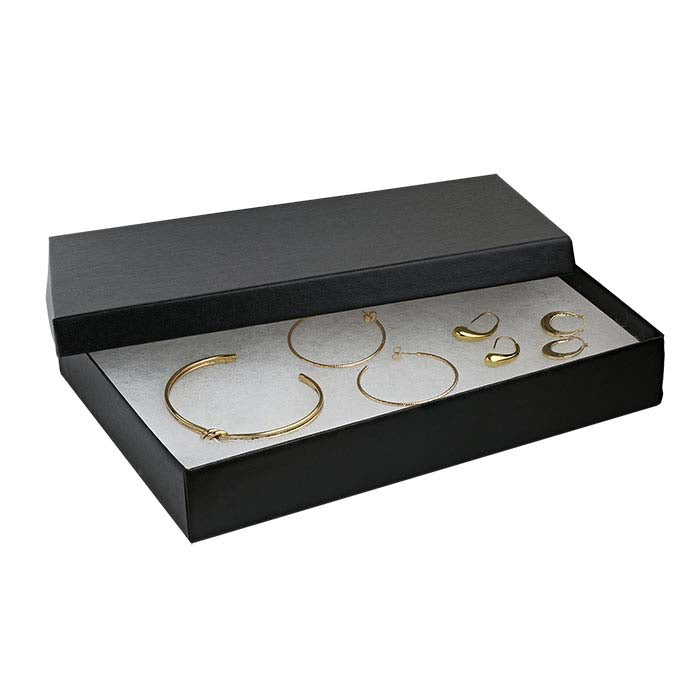 This paper-covered, two-part universal box accommodates a variety of jewelry styles. Use the box as-is, or mix & match it with solid-color cardboard boxes to create color combinations to suit your brand, for seasonal packaging, or for special occasions. Add a decorative ribbon, gift wrapping, or bow (available separately) to customize each box. Black satin-look recycled paper covers the cardboard box; the box includes a 1/2"-thick white poly-fill wadding that will not cause tarnish.Hot stamp your gift box with your company name or logo, keeping you top-of-mind long after the jewelry sale.