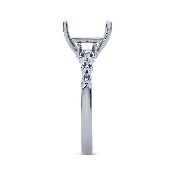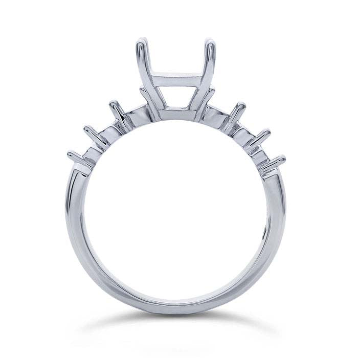 With a classic style, this platinum ring mounting has a center 4-prong basket setting that holds one 7 x 5mm emerald-cut faceted gemstone. Each side is accented by three graduated round prong settings, 3.5mm (0.15 ct., approx.), 2.5mm (0.06 ct., approx.), and 2mm (0.03 ct., approx.). The basket setting features open sides designed to allow more light to reach and move through the stone, enhancing its brightness and brilliance. Cut a seat in the prongs to accommodate your stone, then burnish the prongs over the stone to secure it in place.