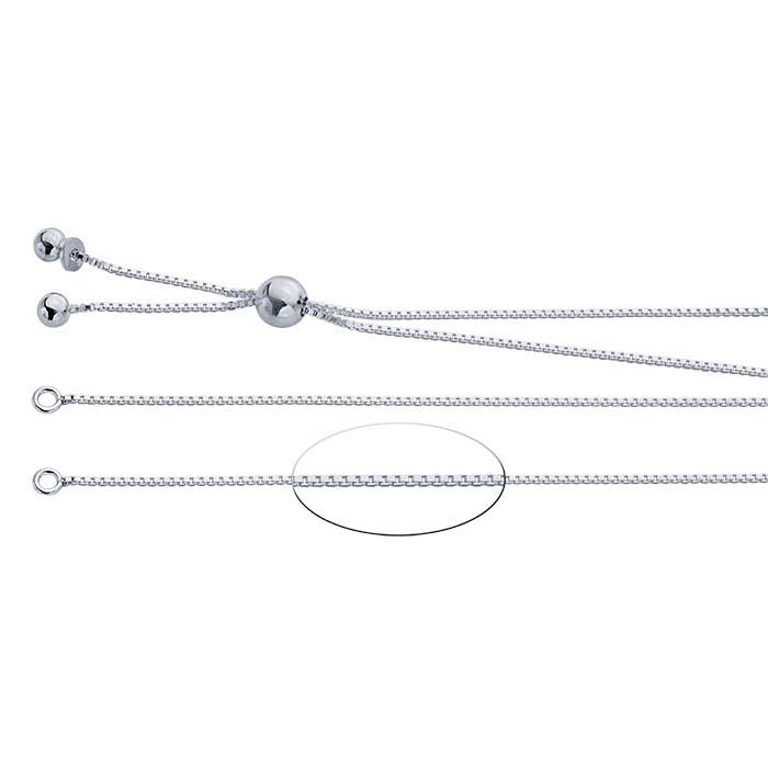 This sterling silver Venetian box chain necklace component is open at the center with a closed ring at each open end (.063" ID); complete the necklace with a festoon component, an engravable plaque, or a short length of strung beads. The necklace is fully adjustable using a movable round silicone-lined bead (6mm) that slides along the chain. Two round drops finish the chain and serve as a stop to keep the slider bead from slipping off the chain.