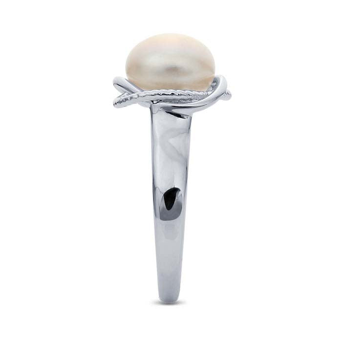 This sterling silver ring is set with an 8mm round white freshwater pearl in a setting with an open weave design. The band has a bright finish and this ring is attractive as a stand-alone accessory.Freshwater cultured pearls are cultivated in fresh water from mussels. According to one legend, the pearl was formed from the tears of the goddess of love. For many, pearls are a symbol of pure heart and mind, honesty and integrity.