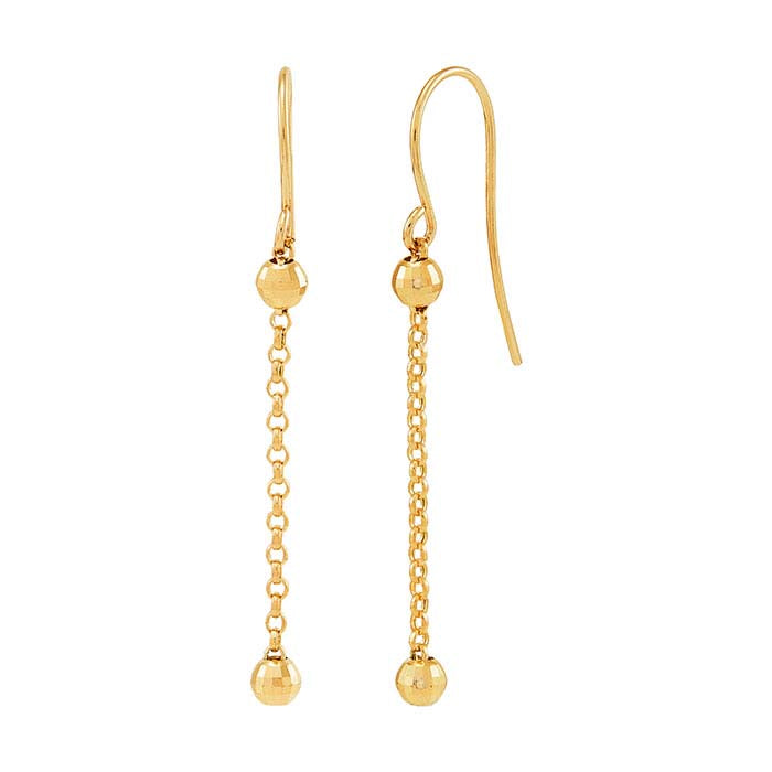 These finished 10-karat yellow gold earrings feature a textured bead with a rolo chain drop.