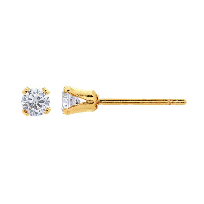 This 14/20 yellow gold-filled post earring features a Snap-Set™ mounting set with one 3mm round white CZ, offering an economical alternative to diamond, the birthstone for April. The friction post features a groove that helps provide the most secure and comfortable fit; post earrings require an ear nut to keep the post in place.