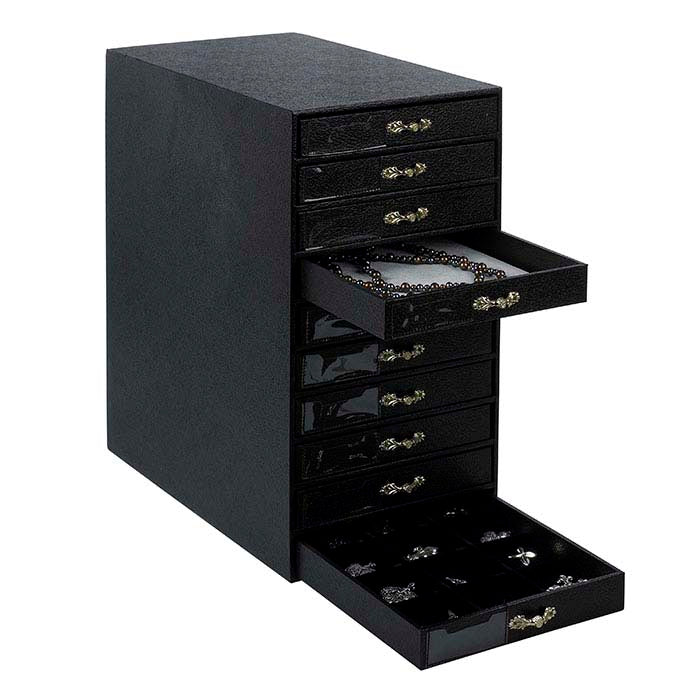 This tower organizer features 10 trays that allow you to organize your findings, gemstones, small tools, and paperwork where they are conveniently close at hand yet ordered and safely out of sight. Each drawer offers a roomy, 1-1/8"-deep interior space that will hold most full-size inserts (14-3/4" x 8-1/4") and can accommodate a variety of items. A clear pocket (2-5/8"W x 1"D) on the front of each tray holds an identifying label. Black paper covers the hardwood cabinet and drawer sides; the drawer bottoms are sturdy cardboard; the pulls are base metal.