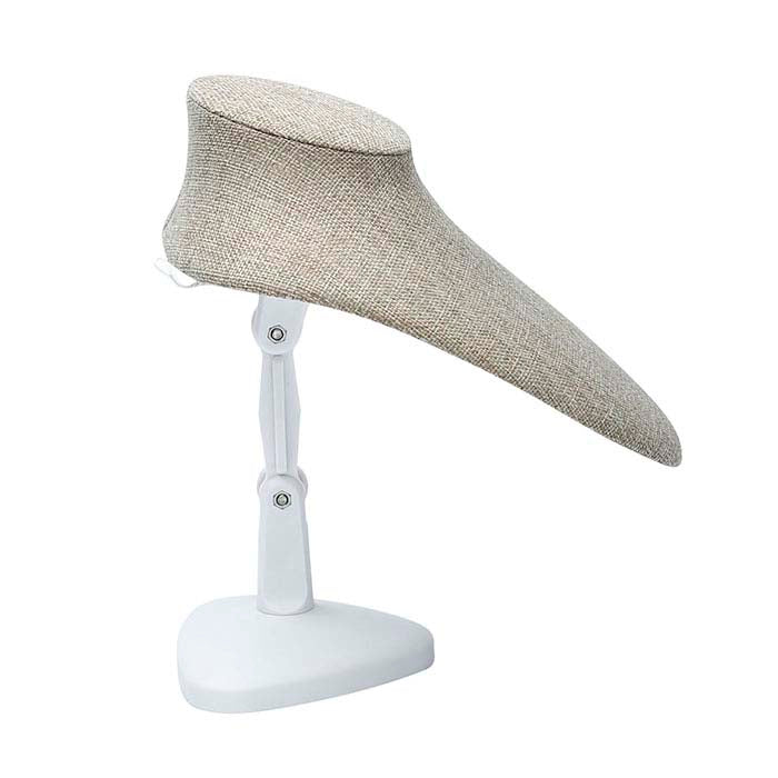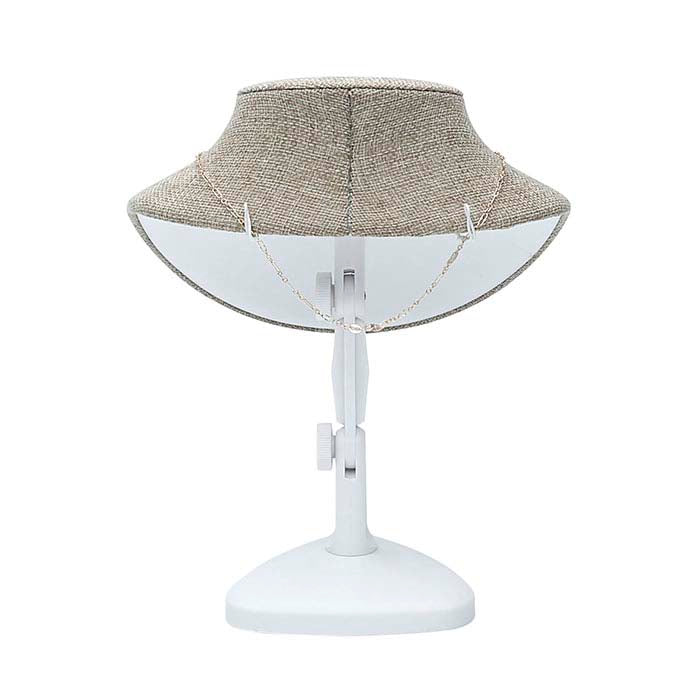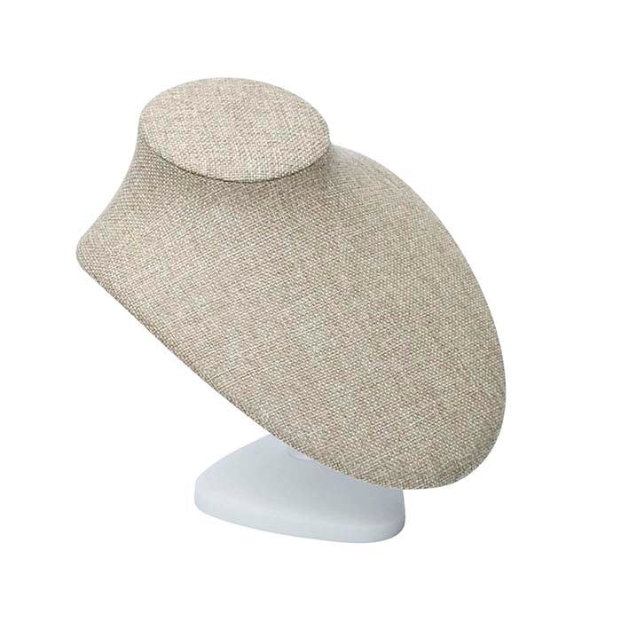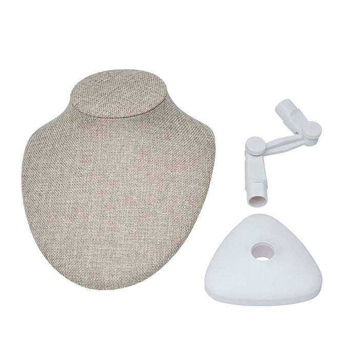 This natural burlap necklace bust is ideal for a variety of showcases and travel; it is fully adjustable, so you can display your necklace at almost any angle. The simple contours of this bust give necklaces and pendants a natural drape so that customers can how the jewelry will look when worn; the burlap offers a subtle, natural color and attractive texture that complements almost any jewelry style. To set height and angle, loosen each thumbscrew on the post and adjust as needed (height adjusts from 5-1/4" to 8-7/8"). For travel, the display separates into three parts, so it is easy to pack and transport. Two wire tabs and an elastic band at the back allow you to adjust the length of the necklace on the bust and to secure any excess chain neatly out of sight. Natural burlap covers molded plastic.