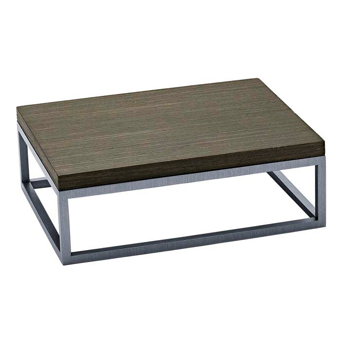 This polished steel riser features a high-end, contemporary look and includes a changeable platform. The riser is ideal for creating an eye-catching presentation—especially when paired with a variety of complementary stands and displays. The dark brown faux-wood material has a realistic grain, a rich feel and a subtle texture that beautifully highlights a variety of jewelry styles. The riser frame is made from hollow steel bars, seamlessly finished and highly polished. “Ebony” textured paper covers a padded MDF form; discreet plastic feet help protect counter-tops, glass displays and other surfaces against scratching.