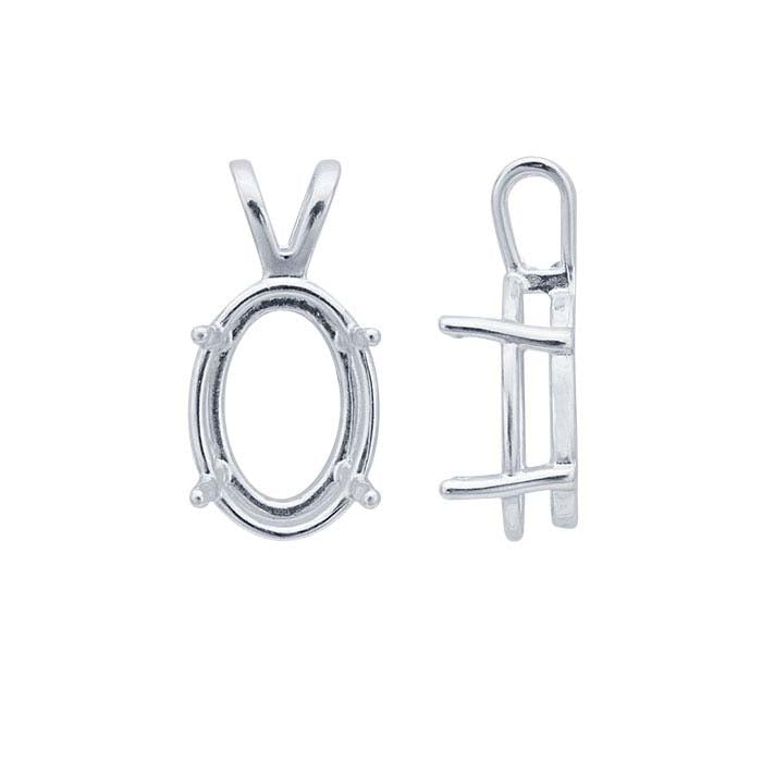 This sterling silver ReadySet™ pendant features a rabbit-ear bail and a 4-prong basket mounting that holds one 14 x 10mm oval faceted gemstone. Easy to set with professional-looking results, ReadySet™ settings have pre-notched prongs that help ensure beautiful, time-saving stone-setting. Basket settings feature open sides designed to allow more light to reach and move through the stone, enhancing its brightness and brilliance. A rabbit-ear bail is a tapered style that is split in half vertically, giving it the appearance of a pair of long, curving rabbit ears. Set your stone into the prongs to check the fit. If necessary, adjust the seat to best accommodate your stone. To secure the stone in place, burnish the prongs over the stone.