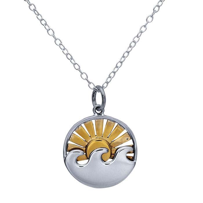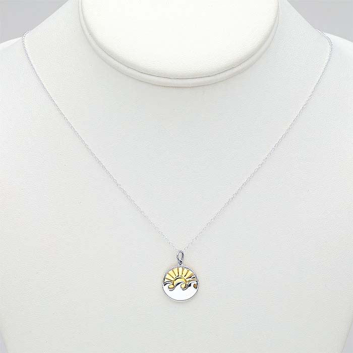 This finished sterling silver cable chain necklace features a 15mm round charm with three waves in front of a bright bronze sun.