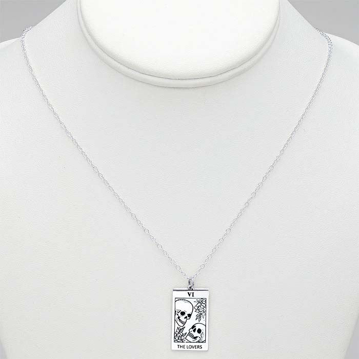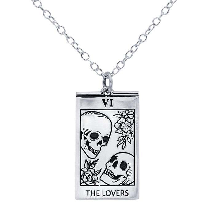 This finished sterling silver cable chain necklace features a 27 x 15mm tarot lover's card pendant. Once named "the choice" in the tarot tradition, this card represents our constant opportunity to choose love by answering what calls to us or choosing what we call toward us.