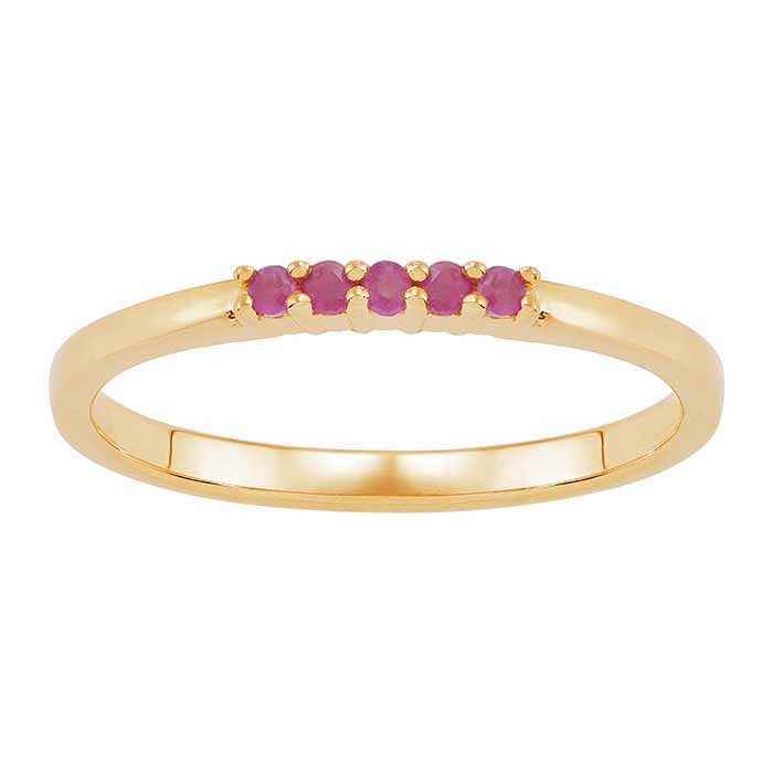 Offering a classic design, this 10-karat yellow gold band is set with five 1.5mm round ruby faceted gemstones, the birthstone for July. The ring looks great as a stand-alone accessory or stacked in combination with other rings.