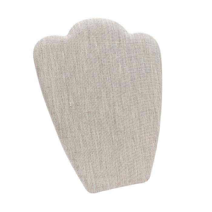 This sturdy easel display, in natural linen, is a quick, easy and attractive way to present necklaces, pendants and chains up to 20" long. The undyed fabric has a natural cream color and a visible weave; its subtle texture helps keep jewelry from sliding out of place. Easels display jewelry at an attractive, easy-to-see angle; the easel back folds flat for convenient storage or transport. Linen covers a padded wood and cardboard form; the easel support is metal.