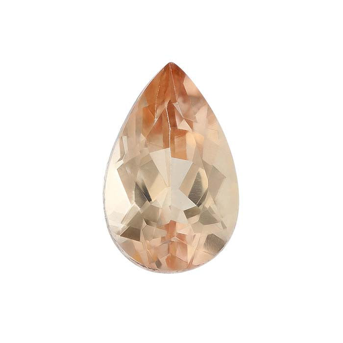 A hard, usually transparent aluminum silicate gem material, faceted topaz has a brilliance that rivals more expensive gemstones, making it an economical alternative to more costly gems. An "8" on the Mohs scale, topaz is tough and durable, ideal for all types of jewelry. Topaz forms in an orthorhombic structure with crystals that are usually prismatic. Pure topaz is colorless; impurities give the gemstone color. Gemstones can appear in a range of colors, with natural pink being the rarest. Most topaz colors are heat-treated or irradiated to enhance their color. In folklore, this gemstone is believed to dispel sadness and fear, to ward off poisons and to reverse infertility.The pear cut is a hybrid of the oval and marquise cuts; it is usually oriented with the point uppermost.